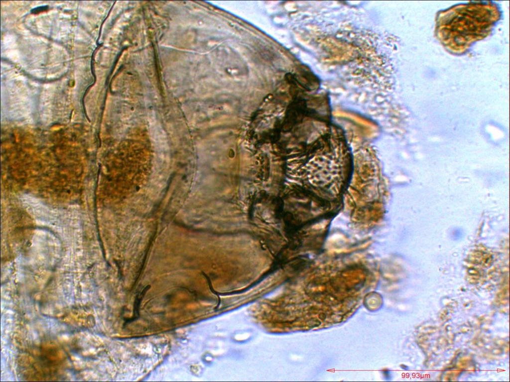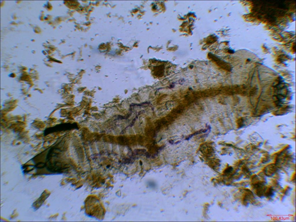 Auf jeden Fall eine Insektenlarve; moeglicherweise eine eucephale Dipterenlarve. Bild 2 zeigt den Kopf, Bild 3 die Stigmen am Hinterende mit den Tracheenbaeumen.