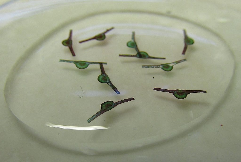 Bild 7: Die fertig gefärbten Blattquerschnitte in Wasser