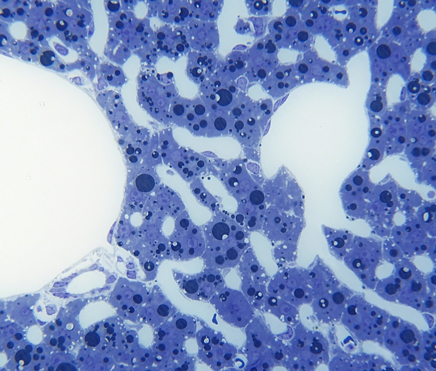 Ich habe gewisse Erfahrung mit Ratten, bei denen im Tierexperiment ein metabolisches Syndrom ausgelöst wurde. Diese zeigten recht rasch nach Beginn der hochkalorischen Ernährung eine deutliche mikrovesikuläre Verfettung der Hepatozyten, die im Verlauf enorme Ausmaße angenommen hat. Das von Dir hier gezeigte Lebergewebe ist davon noch meilenweit entfernt. Wie viel Fett in der Leber der Maus als physiologisch einzustufen ist, weiß ich aus dem Stehgreif nicht zu beantworten. Ich denke jedoch, dass Deine Maus nicht auf Diät gesetzt war und recht üppig versorgt wurde. Daher kann ich mir zumindest gut vorstellen, dass sie vermehrt Fett in die Leberzellen eingelagert haben.