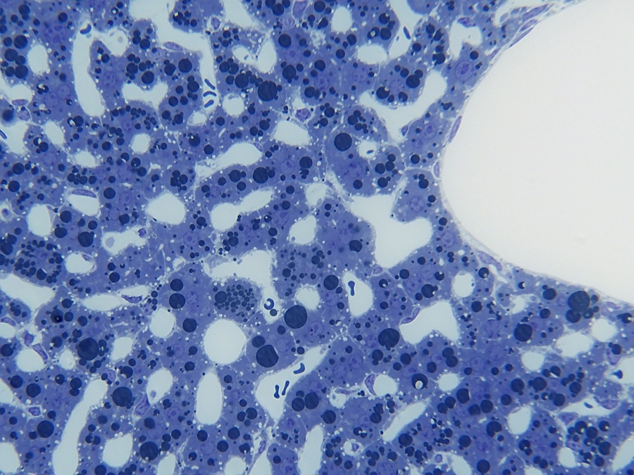 wie so oft bei Deinen fantastischen Schnitten ist die Morphologie für mich, der ich in der Paraffin-Histologie zu Hause bin, schon recht ungewöhnlich. Daher kann ich auch nur begrenzt Auskunft geben, obwohl Lebergewebe für mich beinahe ein tägliches Brot ist.