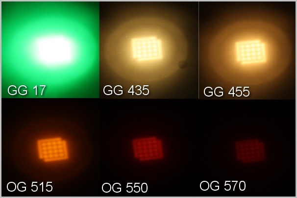 Ich bin von einem farblosen Filter ausgegangen. Der Blick durch das Schaufenster lässt die starke Fluoreszenz des Filters erahnen.