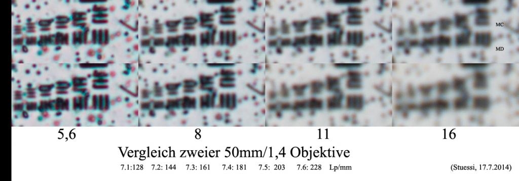 bilde ich mir nur ein, dass je nach Reihenfolge der Abblendung 11/1.4 oder 1.4/11 doch ein deutlicher Auflösungs-Unterschied auf den Bildern zu erkennen ist? Entweder sind die Objektive nicht gleichwertig oder das Streulicht spielt eine Rolle (besser wenn erst die stärkere Abblendung erfolgt)?