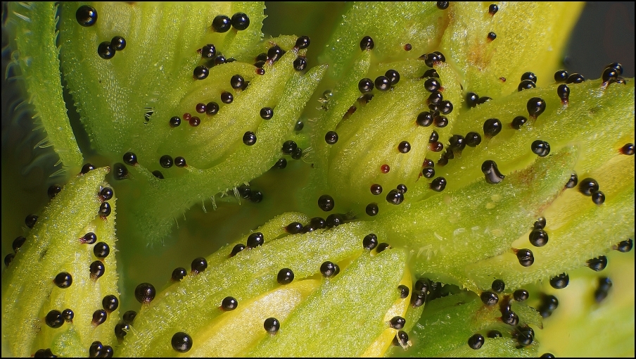 Da die eigentlich randständigen Punkte im Bereich der Blattspitze auch in die Fläche ,,einwandern", war mein ursprünglicher Gedanke der, dass die schwarzen Punkte vielleicht Reifeformen der Öldrüsen sein könnten.