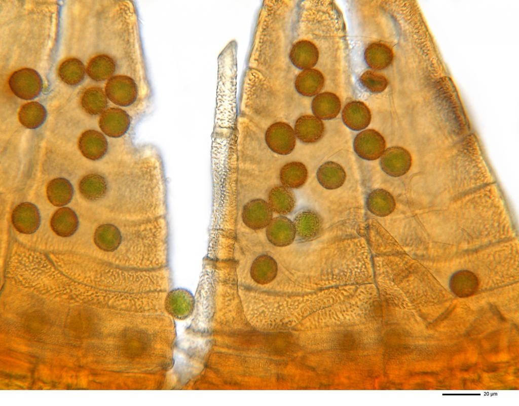 Hier nun ein Bild wie ich es mir wünsche. Es zeigt ein Peristom von Ulota bruchii ebenfalls von der Innenseite betrachtet. Die Ausbildung der Strukturen an den Innenseiten vom Endostom und vom Exostom werden für die Bestimmung dieser Art benötigt.