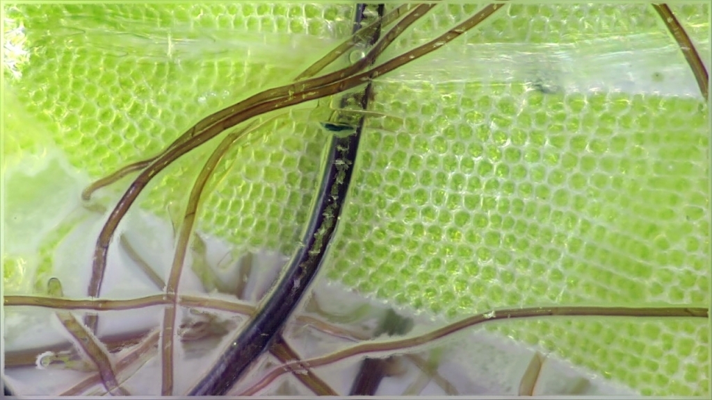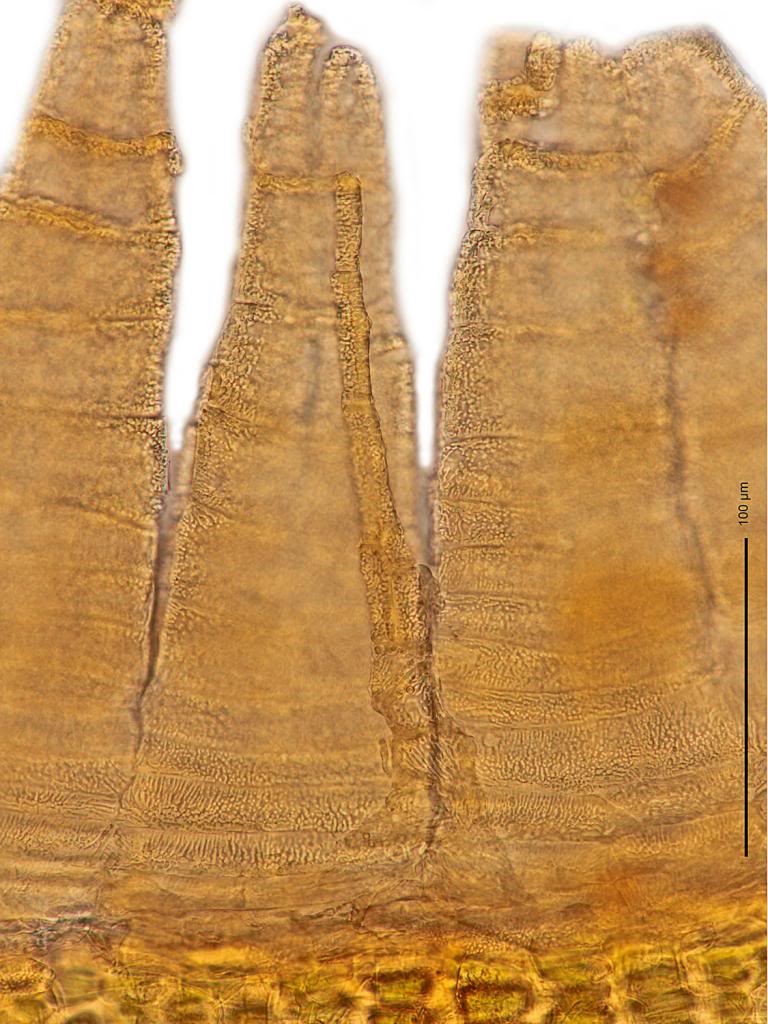 Das untenstehende Bild zeigt ein Ausschnitt von einem Peristom das von Innen betrachtet wird. Verwendet wurde ein Peristom von Orthotrichum patens. Dieses besteht aus dem Exostom das hier breit, kräftig und dunkel ist und dem Endostom das sich hier mit einem feinen, fast hyalinen Zahn in der Bildmitte zeigt. Das Objekt ist mehrschichtig, es ist gegen unten am dicksten und gegen oben wird es immer dünner. Diese Schichten sollen nicht voneinander getrennt werden, denn das Verhältnis zu einander ist für die Bestimmung wichtig.