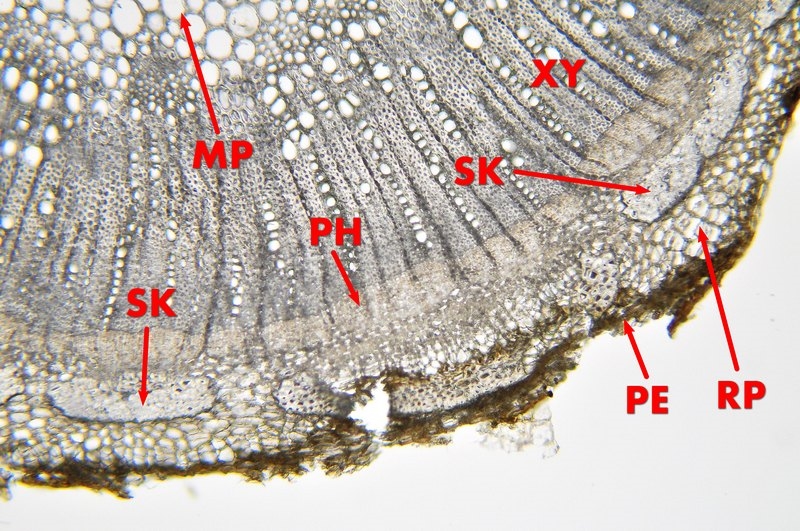 MP = Markparemchym, SK = Sklerenchym – Inseln, PH = Phloem, XY = Xylem, PE = Periderm, RP = Rindenparenchym