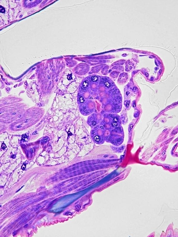 Präparat von Jürgen H.: Schnitt durch den Kopf einer Mücke mit Speicheldrüsen.
