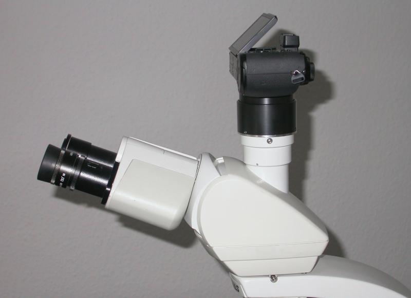 Wer sich die Fotos meines Mikroskops genau angeguckt, sieht, dass am linken Okular noch die Augenmuschel fehlt. Dort befindet sich nur ein Gewindewechsler, an den ich bisher für Fotografiezwecke meine Nikon Coolpix 4500 angeschraubt habe. Diese Lösung wies verschiedene Mängel auf: Das Anschrauben war lästig. Eine Fotografie bei gleichzeitiger Beobachtung durch das Mikroskop war nicht möglich. Erforderlich war stets ein Einzoomen , um die dunklen Ecken auf dem Bild zu beseitigen. Die berühmten Coolpixringe ließen sich nicht immer vermeiden. Vor allem ließen sich die Ausgangspupille des Mikroskops und die Eingangspupille der Kamera so nicht exakt in Deckung bringen, was Mängel der Fotos zur Folge hatte.