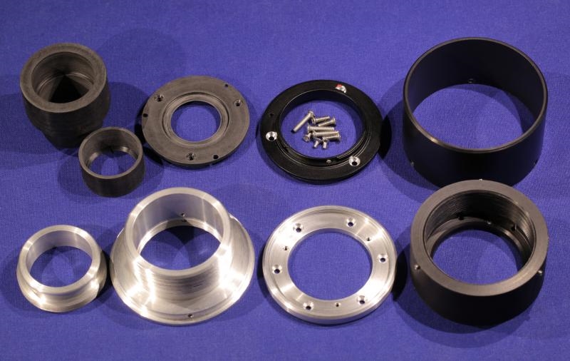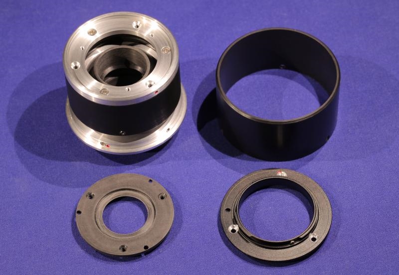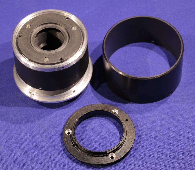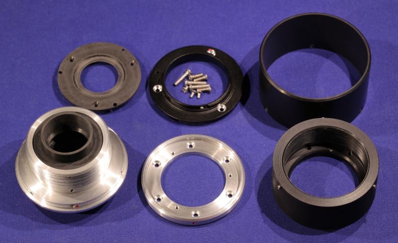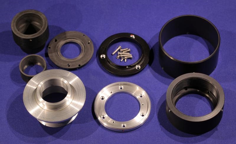 Drei Streulichtblenden aus mattiertem POM sowie eine Außenverkleidung komplettieren den Adapter, dessen Konstruktion auf den nachstehenden Bildern gezeigt wird: