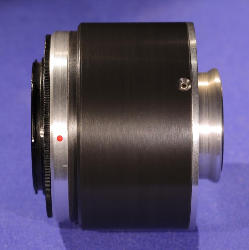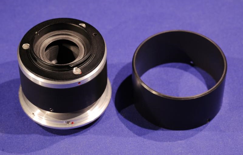 An der Oberseite des Tragrohres aus POM ist eine Halteplatte aus Aluminium verschraubt, die ihrerseits das Kamerabajonett aufnimmt. Ein Bajonett dieses Typs ist im Fotozubehörhandel als sog. 'Umkehrring' oder 'Retroadapter' erhältlich.
