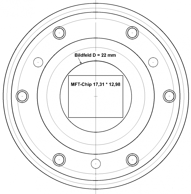 Gezeigt ist hier der vom DMLS zur Verfügung gestellte Bildkreis (Durchmesser 22 mm) mit der dort eingezeichneten Chipgröße einer Micro-Four-Thirds Kamera (Angaben in mm). In der Bildbreite ist demzufolge mit einem Verlust von ca. 22 Prozent zu rechnen, dies ist jedoch auch bei APSC- und Vollformat-Adaptionen der Fall, wenn man vignettierungsfreie Bilder im Rechteckformat erhalten möchte.