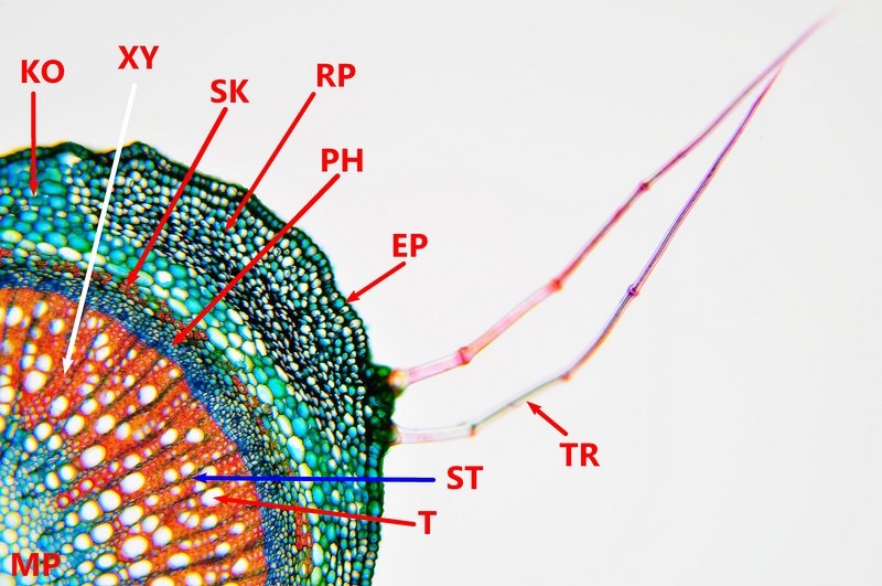 KO = schwach ausgeprägtes Kollenchym, XY = Xylem, SK = Sklerenchym, RP = Rindenparenchym, PH = Phloem, EP = Epidermis, St = Strahl, T = Trachee, MP = Markparenchym, TR = Trichom  (einreihiges, aus 3 – 8 Zellen bestehendes Gliederhaar).