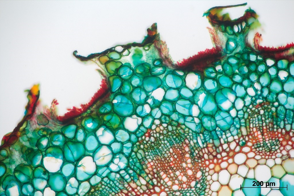 3. Detailaufnahme vom Bereich der Epidermis. Man sieht deutlich, dass der Pilz die Pflanze nur oberflächlich angegriffen hat und nicht tief in das Gewebe eingedrungen ist. Vergrößerung: 100x