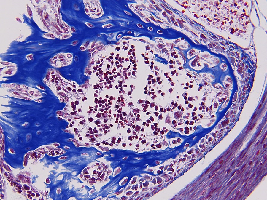 Knochen werden Blau angefärbt. Färbung: Nach ein Rezept von Frank Burr Mallory aus 1900.