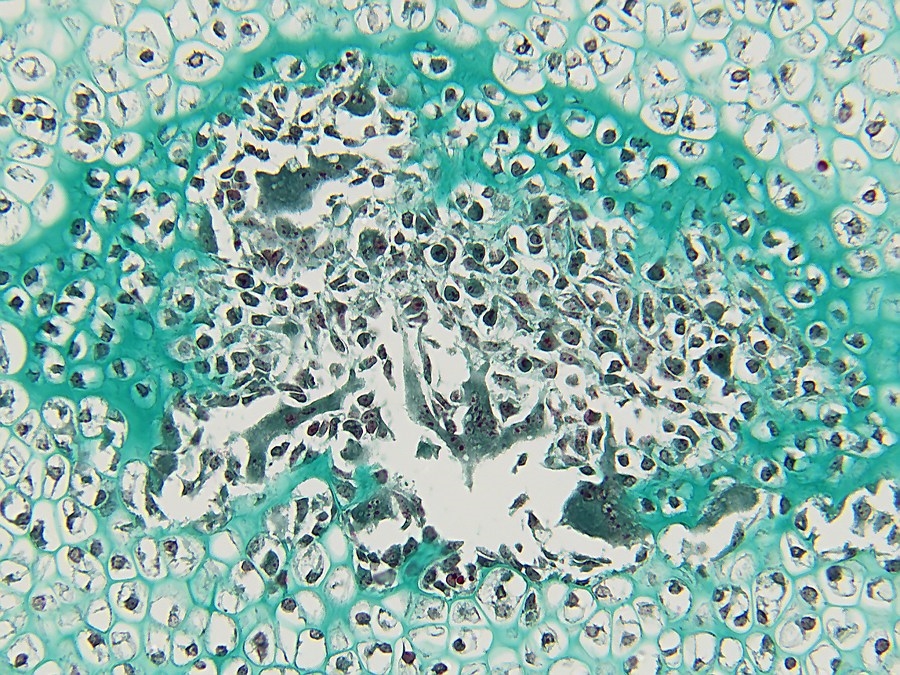 Chondrale Ossifikation, die Osteoblasten und Osteoklasten sind deutlich zu erkennen.