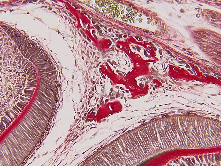 Knochenbildung im Oberkiefer. Links und rechts ist noch gerade etwas von Zahnbildung zu sehen, oben ein Quer geschnittenen Arterie, Objektiv Leitz Plan Fluotar 25x.