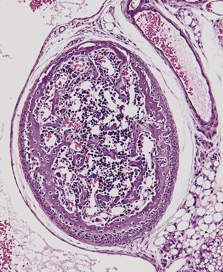 Knochen werden Rosa angefärbt. Färbung: Klassische Hämatoxylin nach Gill und Eosin.