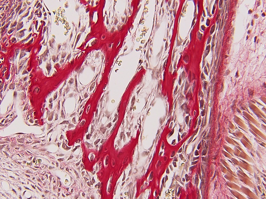 Knochen werden Rot angefärbt. Färbung: Modifizierte ,Van Gieson'. (ich habe das Fuchsin gewechselt mit Thiazin da Fuchsin sehr Sauerempfindlich ist und darum rasch ausbleicht).