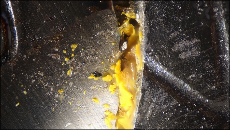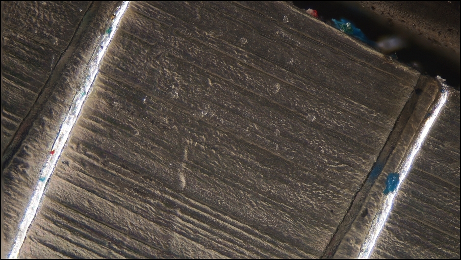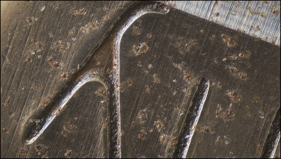 Auch erkennbar, dass die Rechnung des ,,Erfinders" nicht vollständig aufgeht, da trotz Mg-Chassis die Klinge Korrosionsspuren zeigt. Aber, der silberne Schein bleibt gewahrt ...