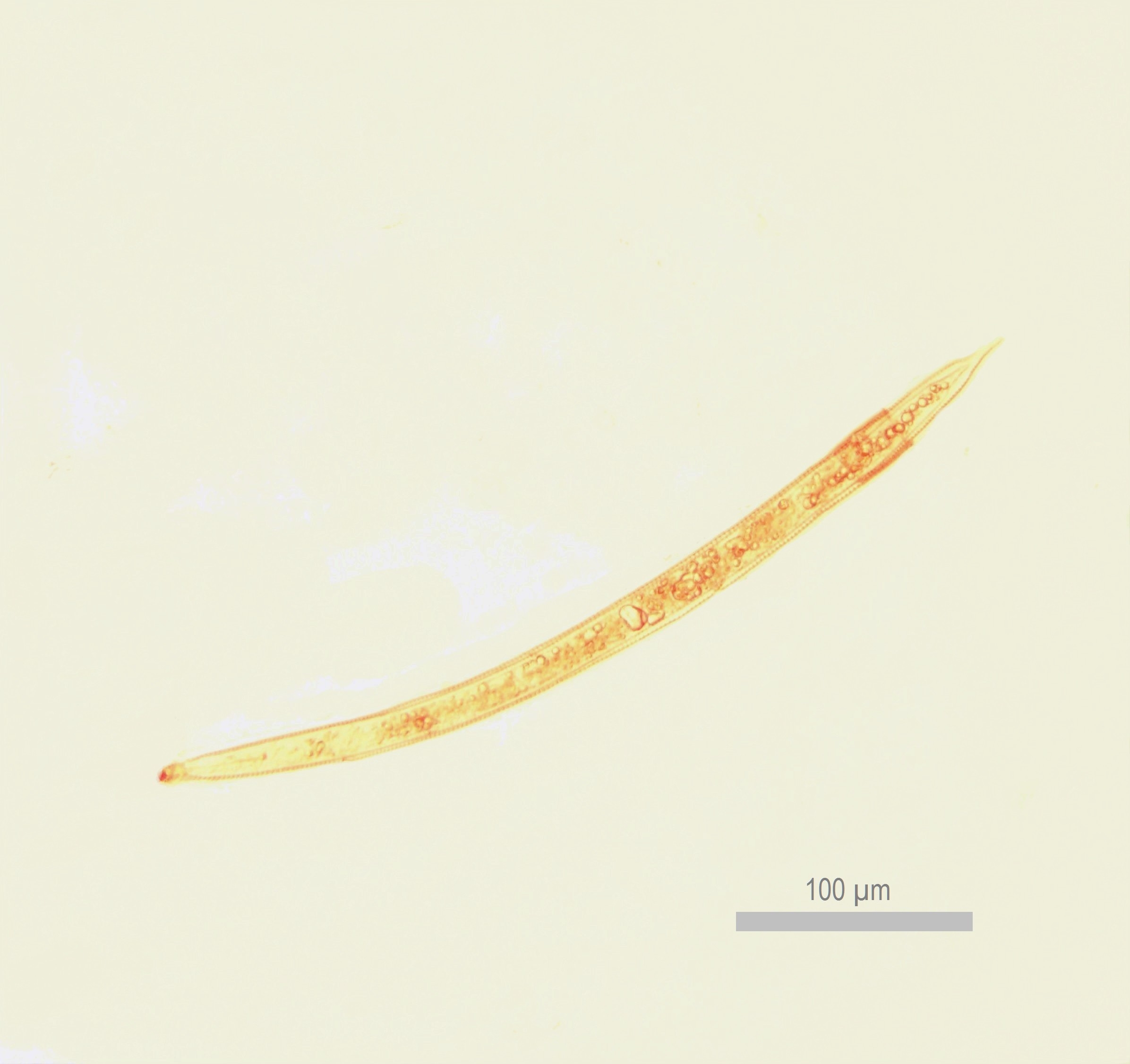 Es scheint eine Nematode mit geringelter Cuticula zu sein. Sicher bin ich mir nicht, aber das waere mein bester Vorschlag.