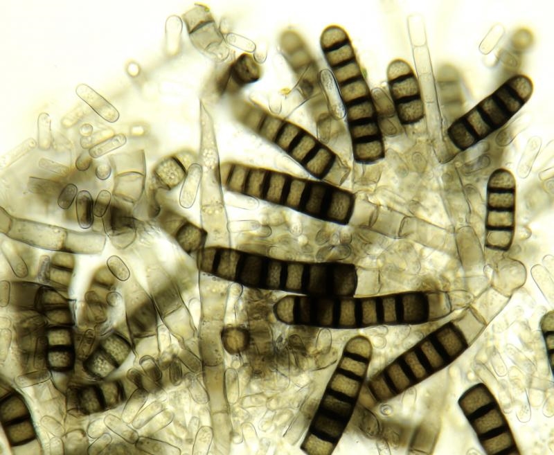Dieser Pilz scheint zwei verschiedene Sporen zu produzieren: die dunkle Strukturen sind mehrzelligen Aleuriosporen und bei die kleine Stäbchen scheint es sich zu handeln um Endosporen.