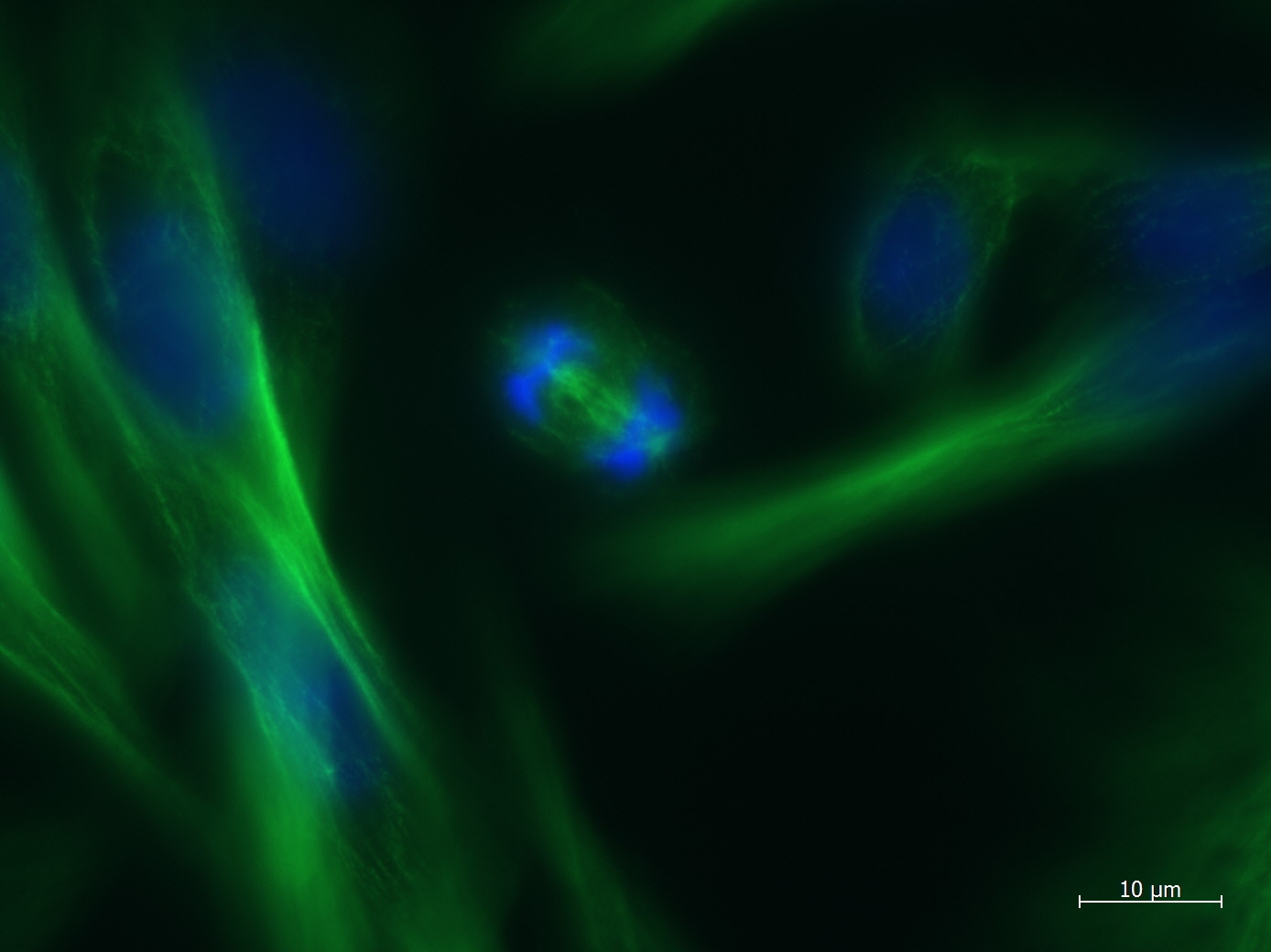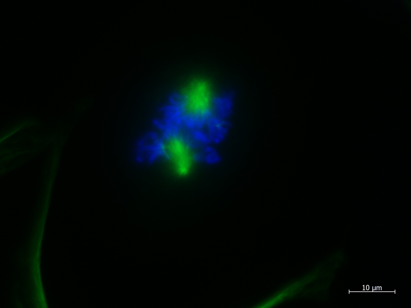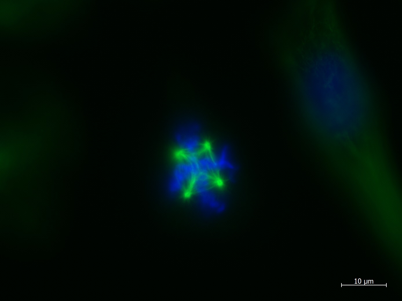 Sehr interessant, hier gibt es vier Mitosespindeln, die Zelle scheint sich zu vier Zellen zu teilen.