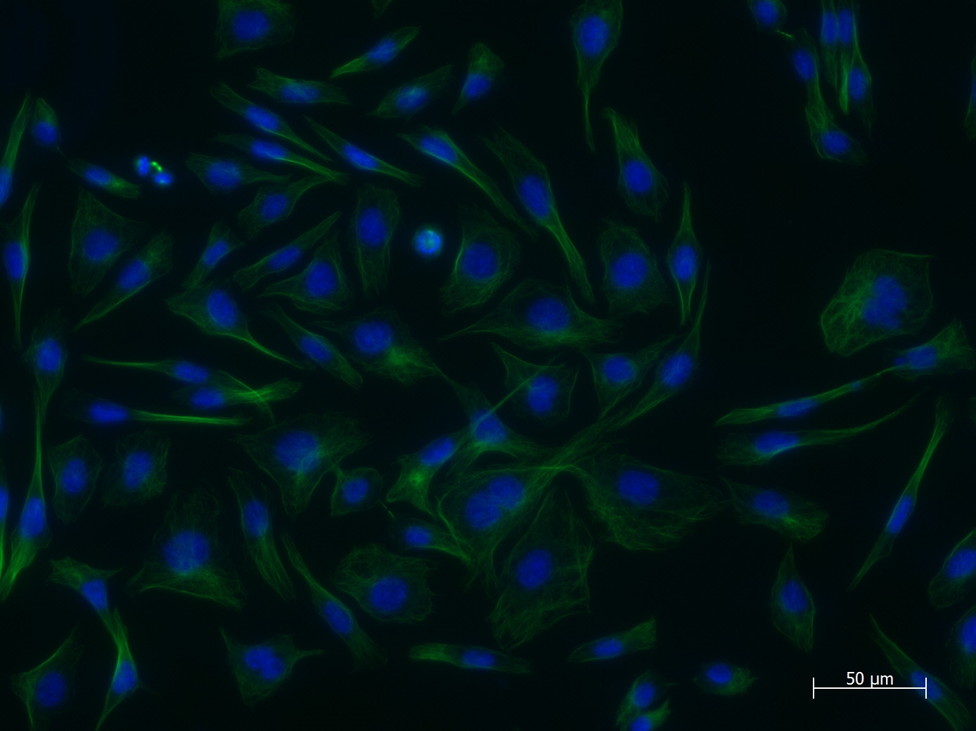 Zellen in Interphase, das Netzwerk der Mikrotubuli ist gut erkennbar.