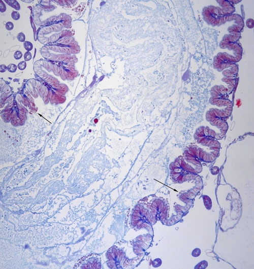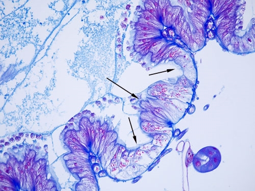 Meines Erachtens sind das klare Beispiele einer völligen Zerstörung der Darmzellen. Zellkerne sind nicht mehr erkennbar. Stattdessen sehen wir nur viele einzelne rote Granula (Reste des Zellkerns?) Insbesondere beim unteren Bild sind die Zellen beim oberen und unteren Pfeil völlig aufgelöst. Aber war hier eine holokrine Sekretion, oder handelt es sich vielmehr nur um erschöpfte verbrauchte Darmzellen?