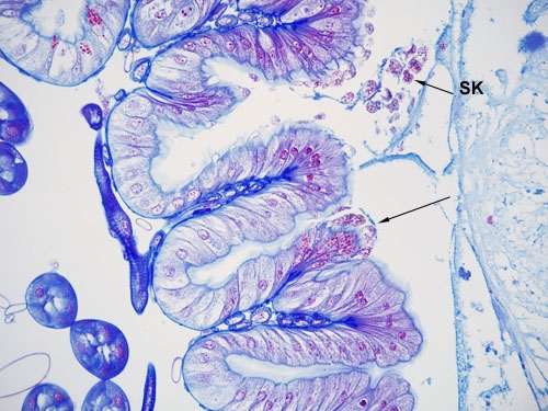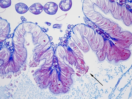 Zuletzt noch ein Bild, bei dem die Wülste der Darmzellen  nur angeschnitten sind: