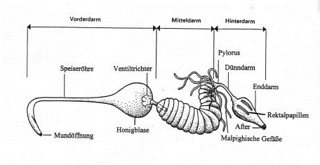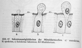und in diesem Zusammenhang auch den grundsätzlichen Aufbau des Mitteldarms von einigen Insekten dargestellt: