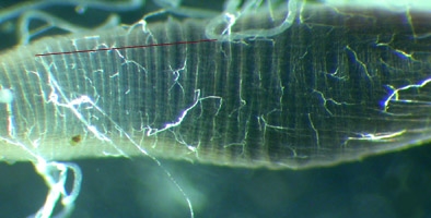 Das ist übrigens ein Technovitschnitt durch einen herauspräparierten Darm der Biene. Technovit scheint sich mir aber  nicht so gut für ganze Insekten oder Insektentagmata zu eignen. Entweder ist die Durchdringung des Insekts mit Technovit nicht wirklich gut oder die Polymerisation läuft innerhalb des Integuments schlecht ab. Außerdem scheint es eine massive Veränderung der chitinösen Strukturen zu geben.