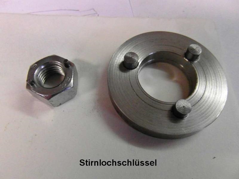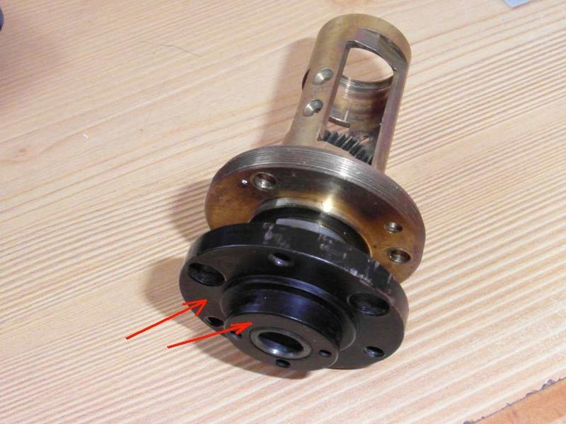 Der nächste Schritt ist, daß ich mir zwei entsprechende Stirnlochschlüssel herstellen muß, um die beiden vermutlich gekonterten Scheiben (rote Pfeile) auseinander zu schrauben.