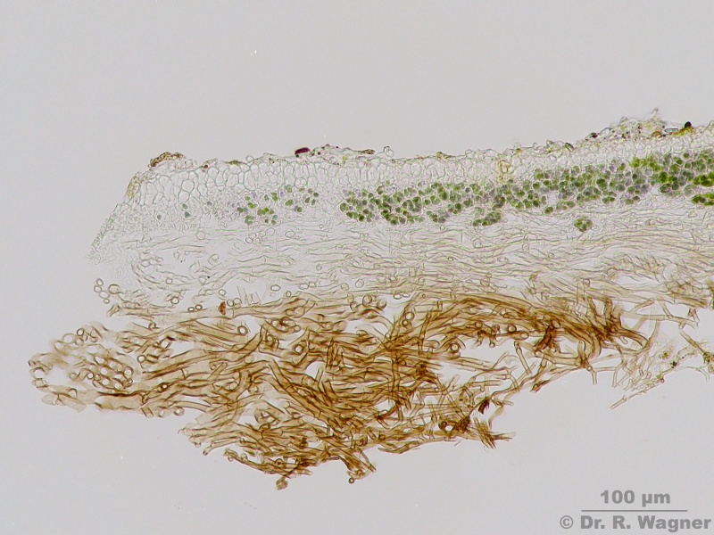 - Lobenquerschnitt. Unter der paraplektenchymatischen Oberrinde liegt die Schicht mit den symbiontischen Cyanobakterien (Nostoc). Darunter folgt das Mark mit locker angeordneten Pilzhyphen. Eine Unterrinde fehlt bei allen Peltigera Arten.