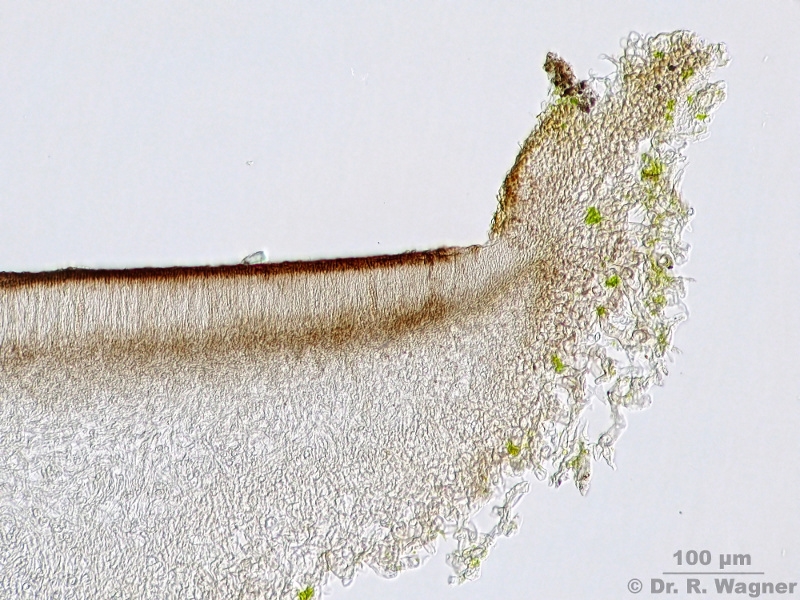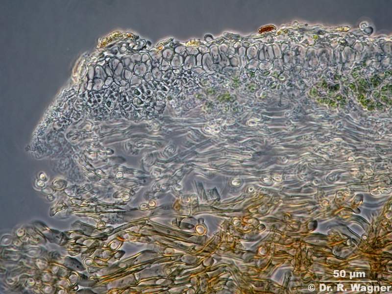 - Lobenquerschnitt. Nahansicht der paraplektenchymatischen Oberrinde. Phasenkontrast, 2 Bilder gestapelt.
