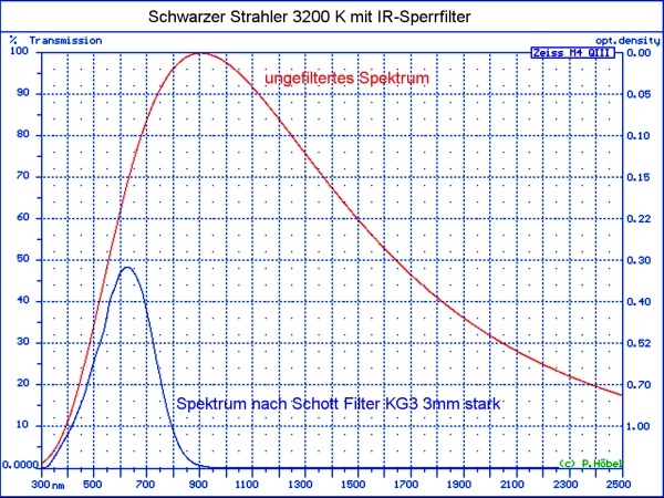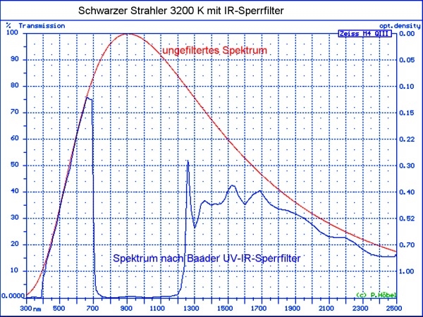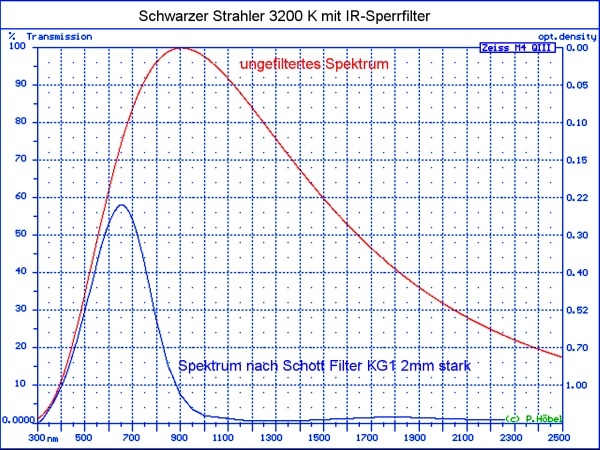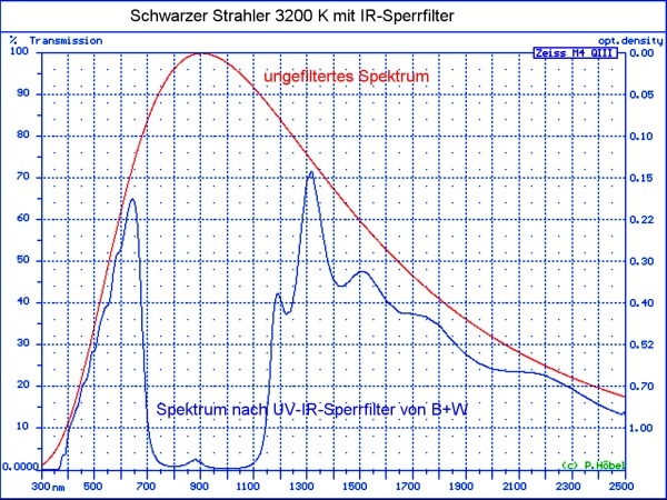 Praktisch alle UV-IR-Sperrfilter auf der Basis der Interferenzfilter lassen nach 1100nm - 1200nm wieder einen hohen Teil an Wärmestrahlung durch.  Viele Absorptionsfilter KG1, KG2, KG3, KG4, KG5 usw (Schott) absorbieren recht gut die IR-Strahlung. Weniger geeignet die Filter der BG38, BG39 - Reihe.