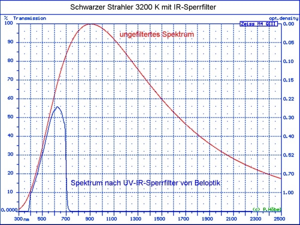 angeregt durch diesen Thread habe ich noch einmal nach einer "idealen" Allround-Filterkombination gesucht, die bei Mikroskopieren mit den unterschiedlichsten Durchlichtquellen (Halogen, Glühlampe, LED - natürlich nicht HBO oder UV-LEDs!) ein maximale Sicherheit gewährt. Dieser Filter scheint für diese Zwecke geradezu optimal zu sein, der er läßt tatsächlich nur das sichtbare Licht passieren und blockt auch - im Gegensatz zu den erwähnten Baader UV/IR-Filtern) die IR-Wellenlängen obrhalb 1400 nm.