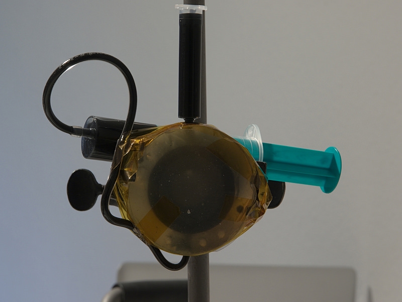 Über den Schlauch von unten fülle ich den Harz ein, wenn die Form sehr knifflig wäre, würde ich eine Schlauchpumpe verwenden (deswegen auch Schlauchpumpen-Schlauch :-) ), aber hier gibt es ja nur eine knifflige Stelle, das Gewinde, durch das durchsichtige Silikon kann man ja gut sehen, wann der Harz an diese Stelle kommt und langsamer füllen. Es darf keine Luftblase entstehen, weil man diese Form nicht vakuumieren kann.