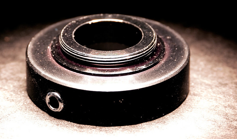 Ich habe also das ,,Abschlussstück" Olympus-Schwalbe auf c-Mount-Gewinde neu hergestellt, indem ich einen Abdruck in Epoxid hergestellt habe. Die Öffnung in der Mitte habe ich danach aufgebohrt. Epoxid lässt sich sehr gut bohren oder fräsen, dennoch ist die Bohrung nicht ganz perfekt geworden, weil der Rohling noch nicht hart genug war um ihn einzuspannen. Beachtenswert an dem Abguss ist das funktionierende mitgegossene Gewinde.