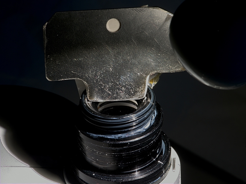 Was nicht geliefert wurde war das Werkzeug um den Spannring für die im Mikroskop integrierte 0,5 x Linse zu lösen, ein heikles Kapitel, denn der Spannring ist verklebt, man muss also gewaltige Kraft aufbringen um ihn zu lösen und deswegen ist ein genau passendes Werkzeug lebenswichtig um den Ring nicht zu beschädigen, was ja dann bedeuten würde, dass man ihn erst recht nicht mehr lösen kann.