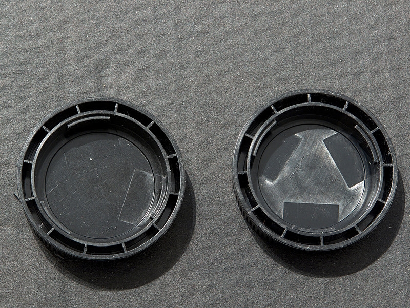 links der abgegossene, recht der originale Verschlussdeckel für das µFT-Bajonett.