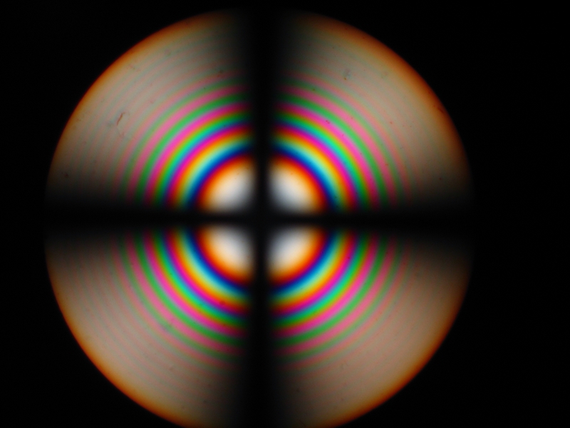 Wenn ichs richtig sehe hast du ein Calzitspaltstück verwendet, das plan aufgelegt kein brauchbares Achsenbild gibt, wie Olaf schon richtig angemerkt hat.es sieht aber so aus, als ob nur ein Verkippen um wenige Grad schon ein schönes Achsenbild ergibt. Kannst du abschätzen um wieviele Grad man das Spaltrhomboeder anheben muss?