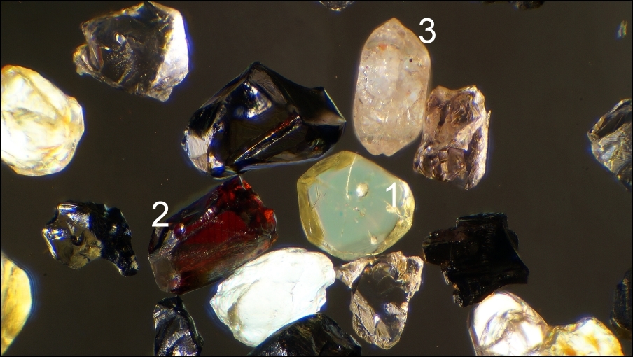 (1) Rutil in Achsllage (?), aber kein Bild mit dem 40er zu erhalten, mit Öl sprich dem 50er oder 100er wollt' ich noch nicht drauf, da das Präp. für die kleineren Objektive dann eingeschränkt ist. (3) Zirkon. (2) kommt dann noch mal: