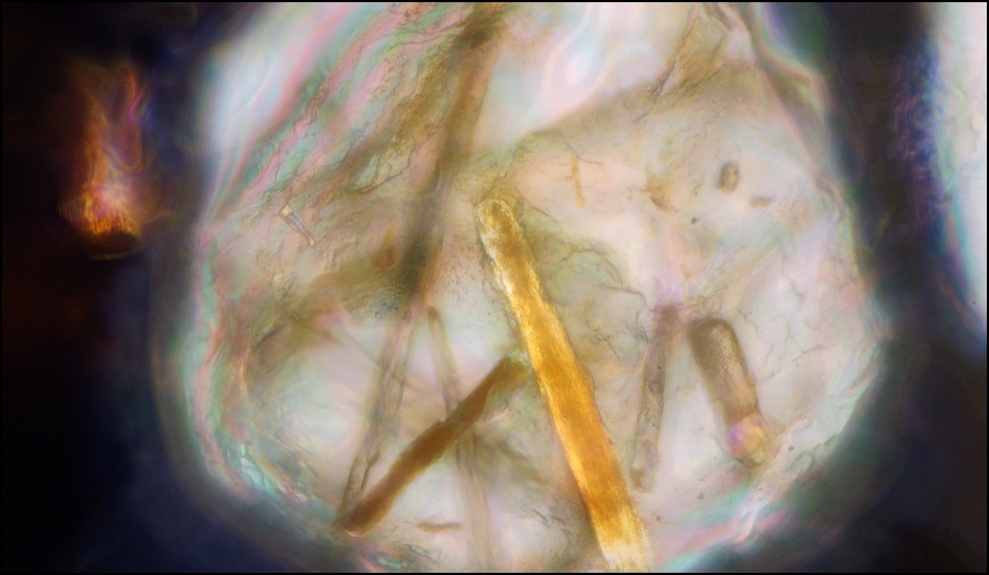 Rutil soll ja nun auch eingewachsen vorkommen. Diese beiden Quarz(?)-Kristalle enthalten Einwachsungen: