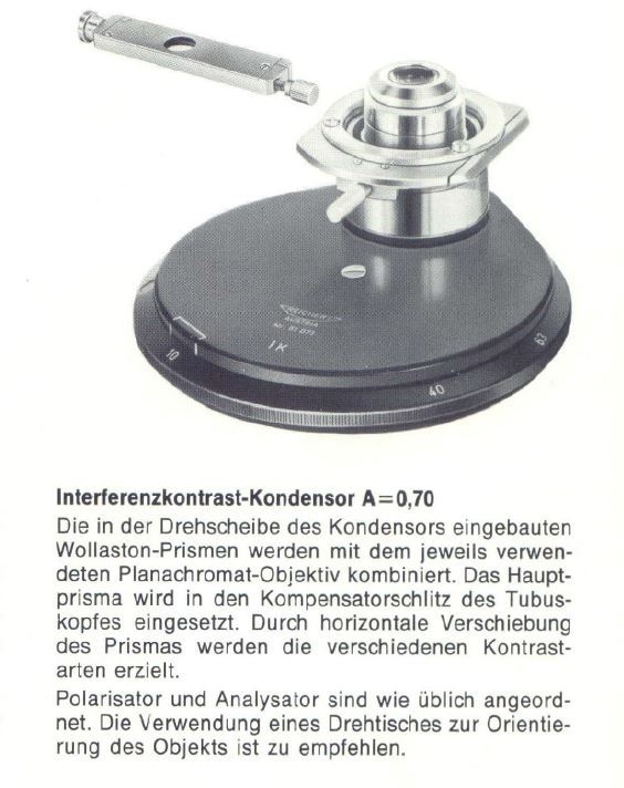 wenn ich mich recht erinnere, ist es bei dem Zetopan-DIC für Durchlicht tatsächlich so gewesen wie beim ersten Zeiss-DIC (den hab´ich selbst): Es gab nur einen DIC-Schieber für oberhalb des Objektives und für die Kompensation gab es mehrere Prismen im Kondensorrevolver.