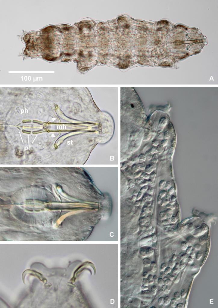 Vertreter der Gattung Macrobiotus zeigen im Bau ihres Pharynx interessante Einzelheiten (Abbildung B und C der folgenden Tafel). Die Mundhöhle (mh) ist schmal und von einer starken Kutikula ausgekleidet, die Stilette sind geschwungen und münden kurz vor der Mundöffnung in die Mundhöhle. Sie sitzen auf federnden Stilett-Trägern (Pfeilspitzen). Der Pharynxkopf ist mit stark kutikularisierten Placoiden (pl) ausgekleidet. Vermutlich dienen sie dem Ansatz der Pharynxepithelmuskelzellen und dienen damit der Verbesserung der Saugwirkung. Abbildung D zeigt die typische Doppelkralle mit einander zugewandten langen Krallenästen. Die Leibeshöhle (Abbildung E) ist häufig auffallend mit rundlichen Speicherzellen gefüllt; die Transparenz des Körpers erlaubt die Untersuchung der Muskelzüge (Abbildung E).