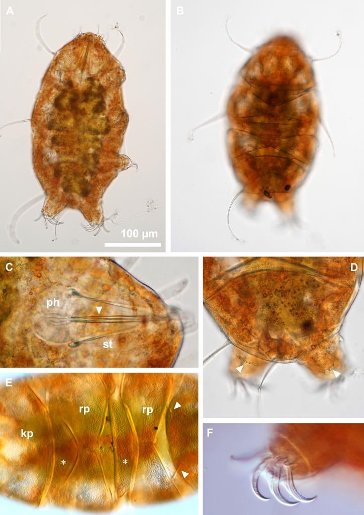 Besonders hübsch - aber aufgrund der intensiven Pigmentierung schwer zu fotografieren - sind Bärtierchen aus der Gattung Echiniscus. Diese Tiere zeigen eine auffallende Panzerung insbesondere auf der Rückenseite (Abbildung B, E). Die Kopf- und Rumpfpanzerplatten (kp, rp in Abbildung E) sind durch weichhäutigere Zwischenplatten (*) voneinander getrennt. Die Rumpfpanzerplatten tragen arttypische Fortsätze und Dornen (fadenförmige Anhänge in A und B, Pfeilspitzen in E). Die Mundhöhle ist sehr schmal, die Stilette sind nadelförmig (Abbildung C). Am letzten Beinpaar sitzt jeweils ein Dornenkranz (D, Pfeilspitze). Die Teilelemente der Krallen sind untereinander gleichförmig ausgebildet.