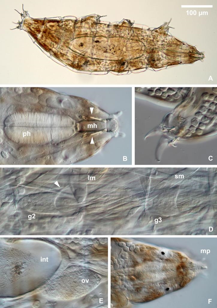 Exemplare der Art Milnesium tardigradum stellen die größten Vertreter der Bärtierchenfauna im Moos dar. Die Tiere erreichen gut 600-700 µm Gesamtlänge. Auffällig sind lange, hakenförmige Krallenfortsätze (Abbildung A, C) sowie abgerundete Papillen um die Mundöffnung (Abbildung B, F). Die Mundhöhle ist geräumig, der Stilettapparat vergleichsweise gering ausgebildet (Abbildung B, Pfeilspitzen markieren Stilette). Im Saugpharynx (ph) lässt sich die radiale Anordnung der kontraktilen Elemente innerhalb der Pharynxepithelzellen erkennen (feine parallele Streifung). Durch rasche Kontraktion dieser Epithelmuskelzellen erweitert sich das Lumen des Pharynx, wodurch die Nahrungspartikel eingesogen werden können. Die hohe Transparenz der meisten Tardigraden erlaubt auch das Studium ihrer inneren Organisation - selbst im Frischpräparat. Abbildung D zeigt zwei der bauchseitig gelegenen Ganglien (Nervenzellbündel, g2 und g3) sowie davon in die Peripherie ziehende Nerven (Pfeilspitze). Außerdem lassen sich einzelne Längs- und Schrägmuskelzüge erkennen (lm, sm). Der Magen (Abbildung E, int) ist von einer fädigen Nahrungsmasse erfüllt, das Ovar (ov) zeigt nur sehr kleine Kerne in den heranreifenden Eizellen - offenbar handelt es sich um ein noch junges Exemplar.