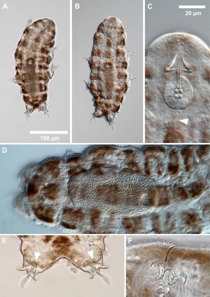 ... hier als Ergänzung noch einige Abbildungen einer weiteren Art, diesmal aus der Gattung Hypsibius. Diese Tiere zeigen eine hübsche bräunlich-rötliche Pigmentierung mit segmentaler Anordnung. Das abgebildete Weibchen zeigt eine große, mit Speicherstoffen angefüllte Eizelle (Abbildung D). Interessant ist der sehr schmale Ösophagus (Abbildung C). Das Tier befindet sich offenbar kurz vor der Häutung - am hinteren Beinpaar sind schon die neuen Krallen angelegt (Abbildung E, Pfeilspitzen).