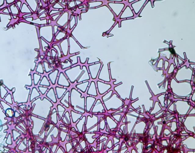 Hier noch das Mark aus einem anderen Foto, etwas herausvergrößert. Leider ist das Mark sehr anfällig für Luftblasen, unter jedem Kreuzungspunkt des sternförmigen Aerenchyms liegt eine: