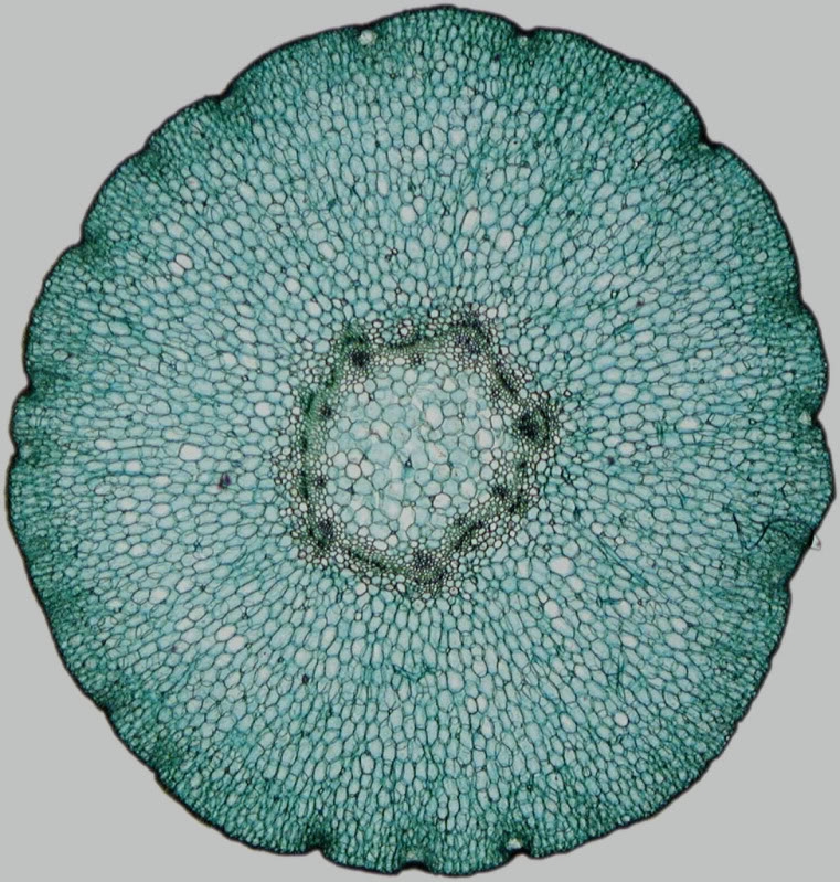 Die Euphorbien haben oft so eine klebrige Milch, die das Färben erschweren kann, wenn nicht entfernt. Und da ist ja fast kein lignifiziertes Gewebe drin. In der Vergrößerung sieht man etwas Xylem, das leicht rosa wirkt - man sieht aber auch, dass der rote Farbstoff schon wieder herausdifferenziert wurde (leicht verwaschene Farbfahnen aus dem Gewebe heraus).